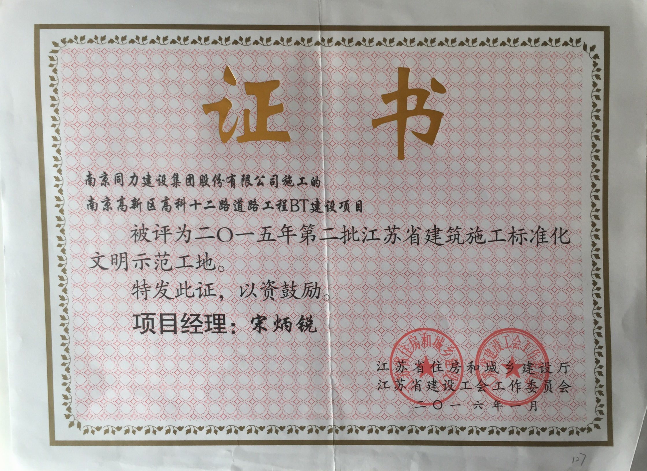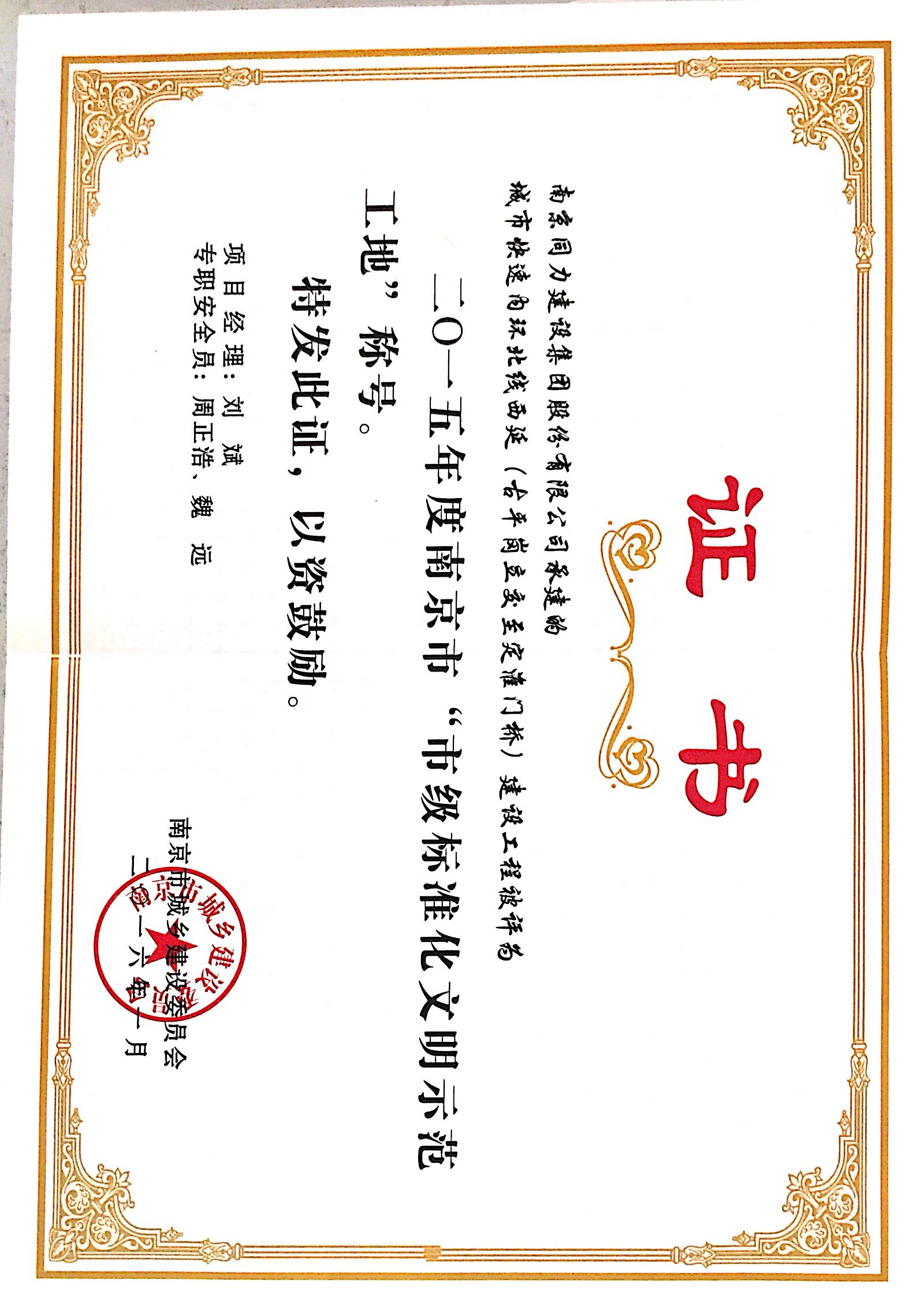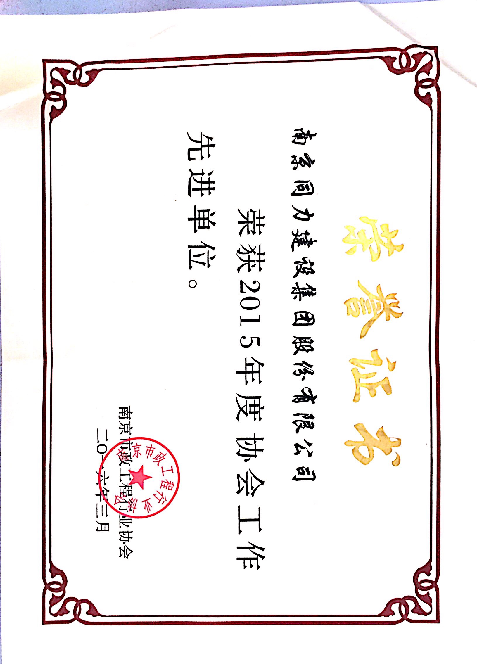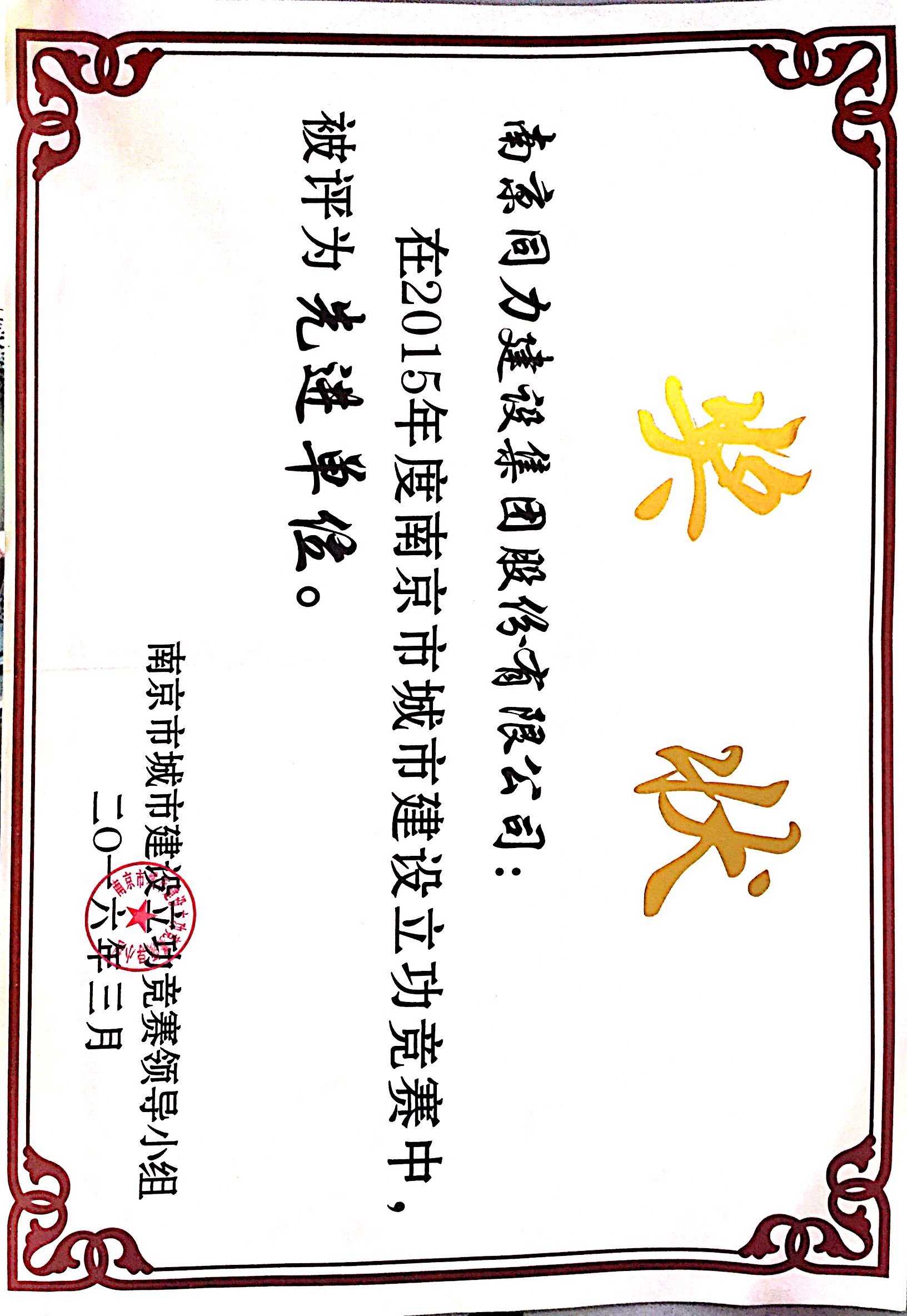 公司被評為“2015年度南京市城市建設(shè)立...