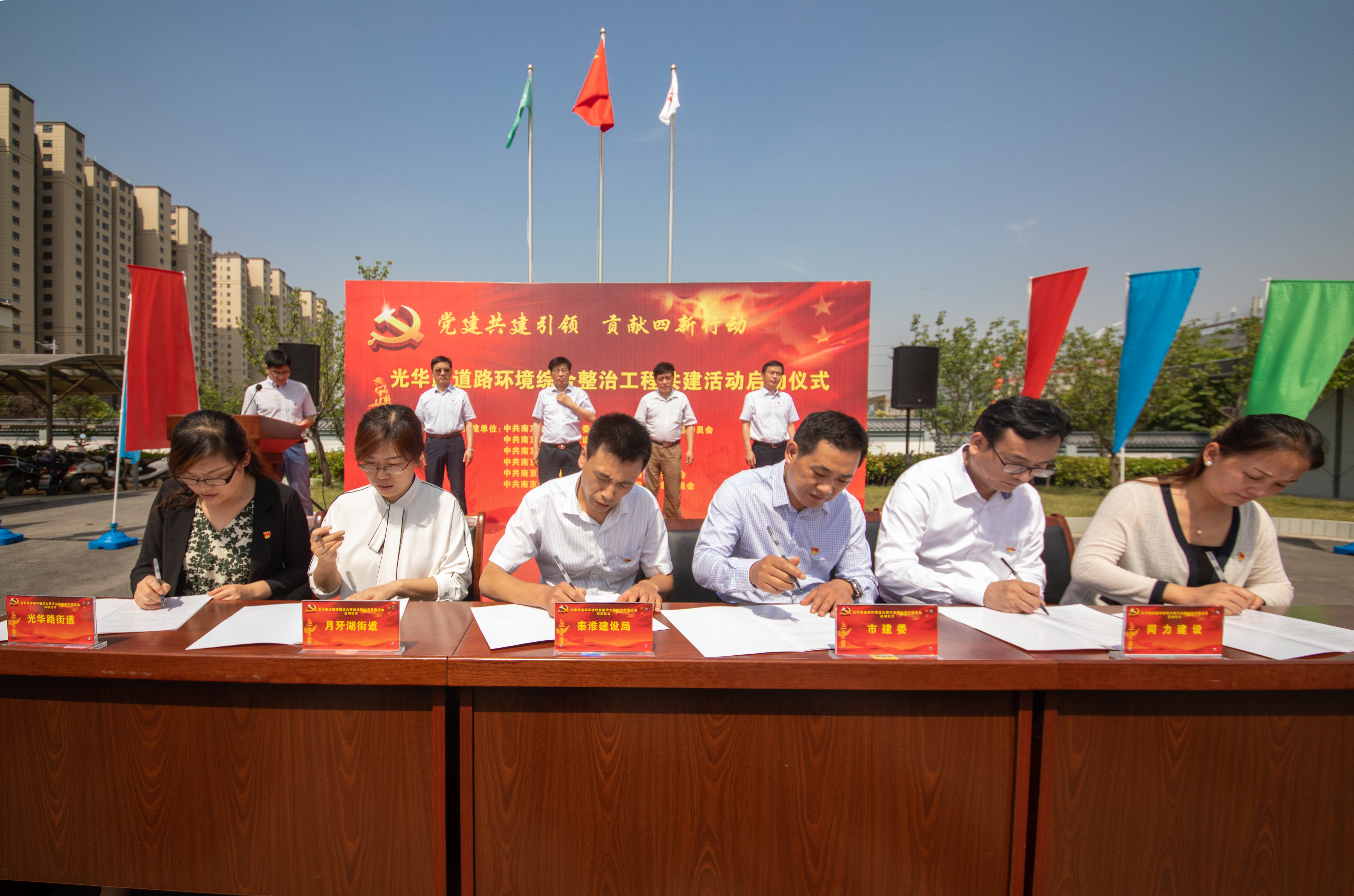 市建委機關第六支部王濤,秦淮區(qū)建設局黨總支書記、副局長顧海,秦淮區(qū)光華路街道黨工委副書記溫秀芬,秦淮區(qū)月牙湖街道黨工委副書記曹森,白房房屋報修服務有限公司黨支部副書記、總經(jīng)理方春梅,同力建設集團股份有限公司黨總支書記仇偉明共同簽訂黨建共建協(xié)議書。