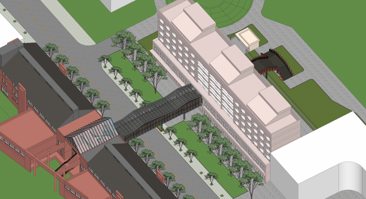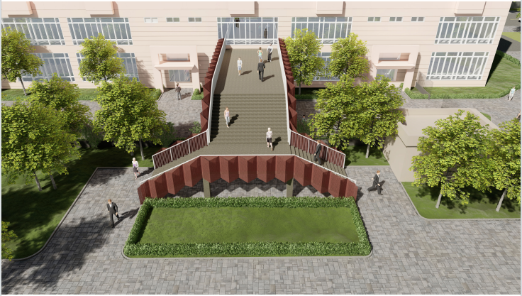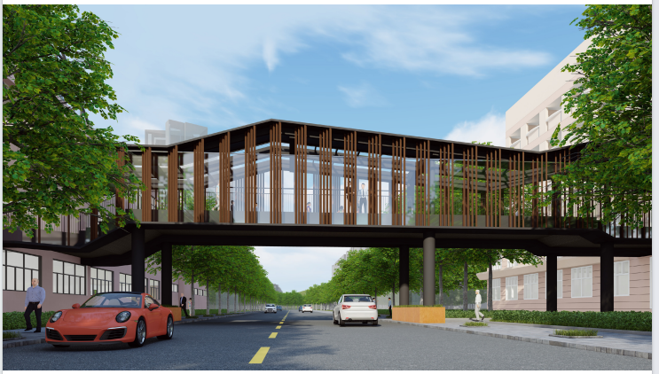 人行過街天橋總長37m,寬6m,總高9m,在北校區(qū)新建鋼筋混凝土室外樓梯,新建室外樓梯和過街天橋通過北校區(qū)內(nèi)通道相連。天橋及室外樓梯外側(cè)采用玻璃幕墻、鋁格柵、穿孔鋁板裝飾,創(chuàng)造出一座充滿節(jié)奏和韻律,又能彰顯人文氣質(zhì)的城市地標天橋。